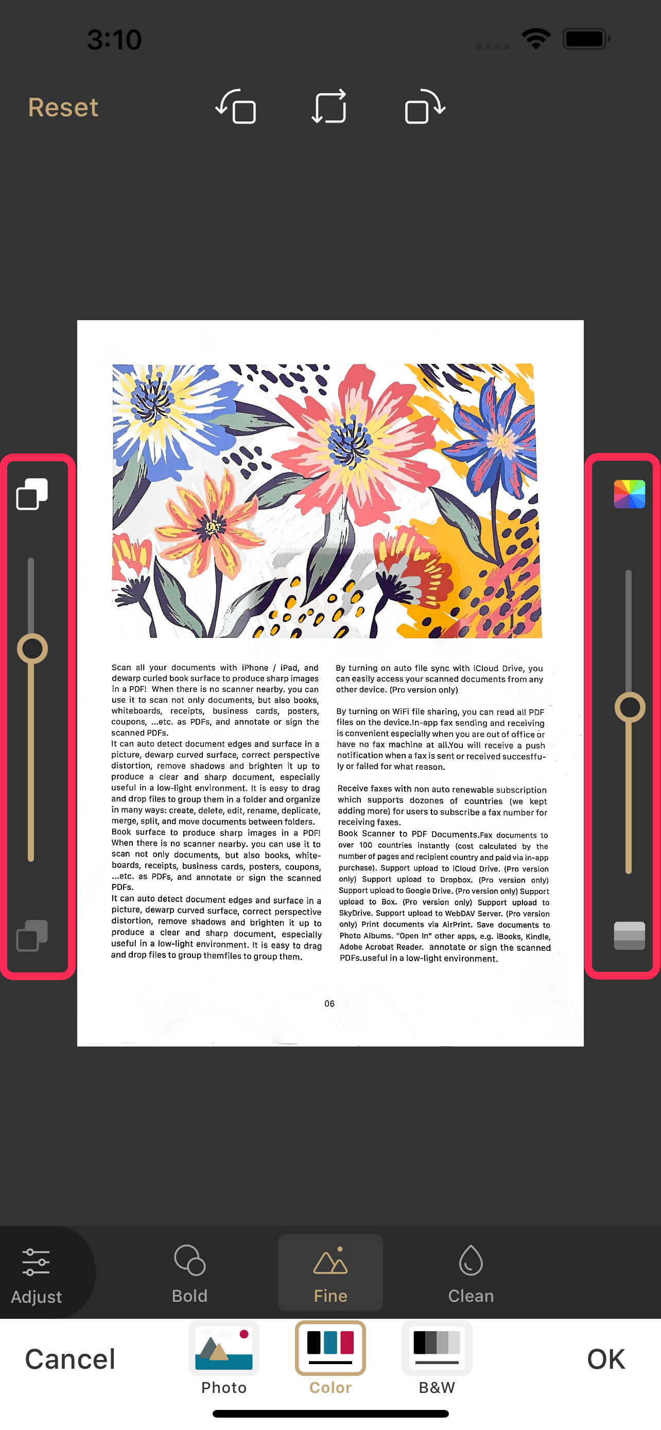 If you selected Color or B&W mode, tap the Adjust button in the bottom left corner to enter the the full adjustment panel.